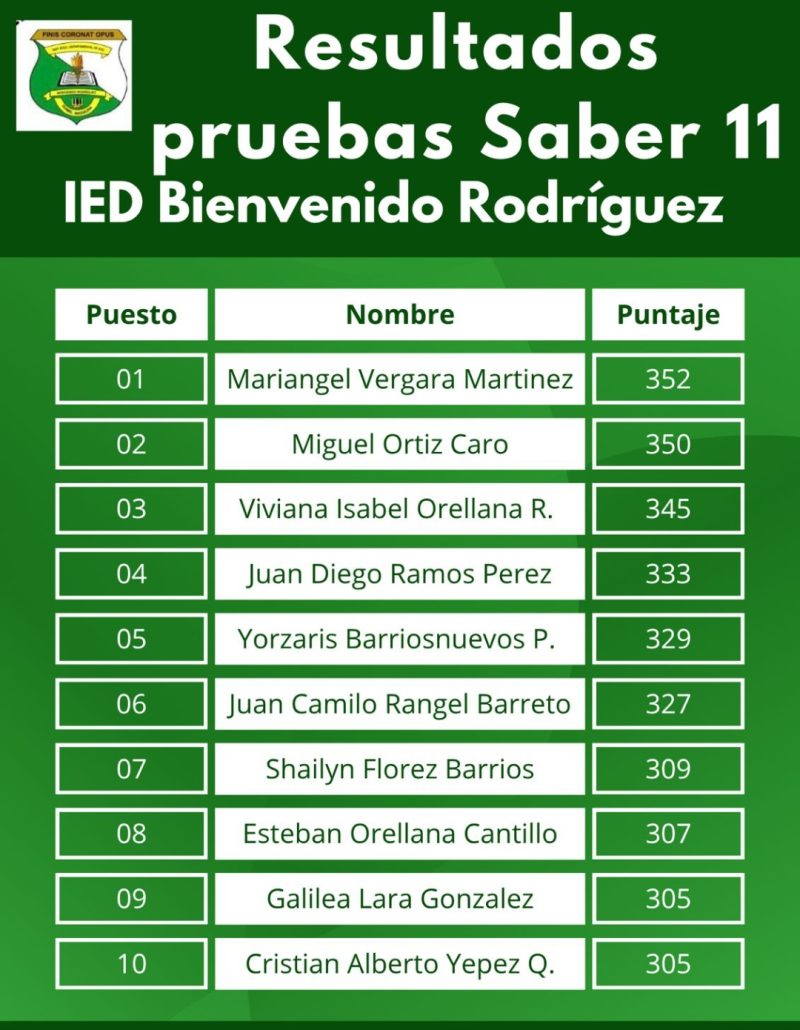 La institución educativa Departamental Bienvenido Rodríguez expresa su reconocimiento público a nuestros estudiantes que se destacaron en las pruebas Saber 11 – 2025, demostrando altos puntajes y un desempeño que refleja su talento, disciplina y perseverancia. Estos logros no serían posibles sin el trabajo colaborativo de toda la comunidad educativa: docentes comprometidos, directivos que lideran con visión y, especialmente, la admirable gestión de nuestro rector Everaldo Tinoco Angarita.